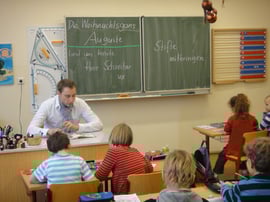 Erwartungsvoll blickten mich die insgesamt 20 Erst-, Zweit- und Drittklässler an, als ich den schön geschmückten Klassenraum mit dem Buch unter dem Arm betrat. Zunächst wollte ich aber von den Kindern wissen, wie sie selbst die Weihnachtszeit verbringen, was sie sich vom Weihnachtsmann wünschen und natürlich, was es am Heiligen Abend zu essen gibt! Vom Gänsebraten war keine Rede und deshalb nutzte ich auch sogleich die Gelegenheit, um kurz von der Weihnachtsgans Auguste zu erzählen und schließlich aus dem Buch von Friedrich Wolf vorzulesen.
